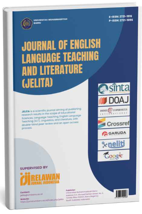 Journal of English Language Teaching and Literature (JELITA) is a scientific journal published twice a year (February and August). This journal publishes articles in the fields of education sciences, language teaching, English teaching, literature, and linguistics. It has p-ISSN 2721-1096 and e-ISSN 2721-1916. Articles could be the results of research or conceptual review and should not have been published in other publications elsewhere. The prefix DOI of JELITA is 10.56185. The language of the manuscript to be published in JELITA is English.